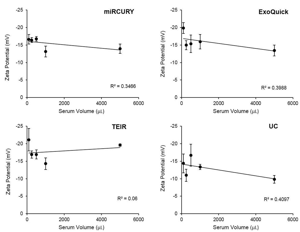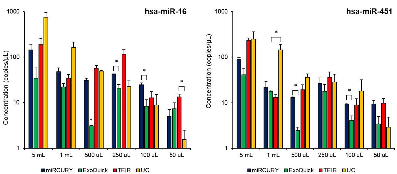 [miRCURY, ExoQuick, TEIR(Total Exosome Isolation Reagent)]를 통해 비교하였고 암에 걸리지 않은 사람의 혈청을 6가지 용량으로 사용했습니다(5㎖, 1㎖, 500㎕, 250㎕, 100㎕, 50㎕).