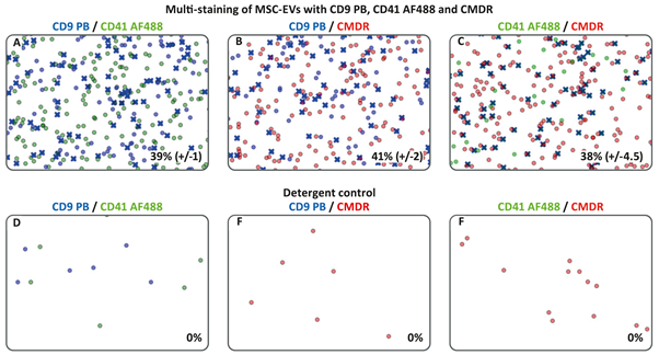 각 파란색, 녹색, 및 빨간색 점은 각각 CD9, CD41 및 CMDR에 대한 EV 양성을 나타냅니다.