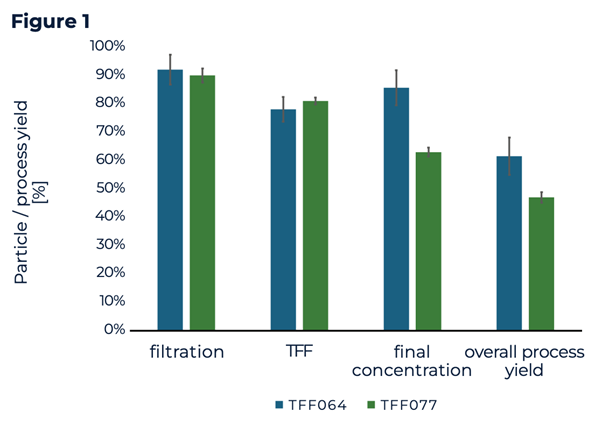 입자 수율은 다음과 같습니다. 심층 여과 : ~ 90% ; TFF ~80%; 최종 농도 : 65-85%,