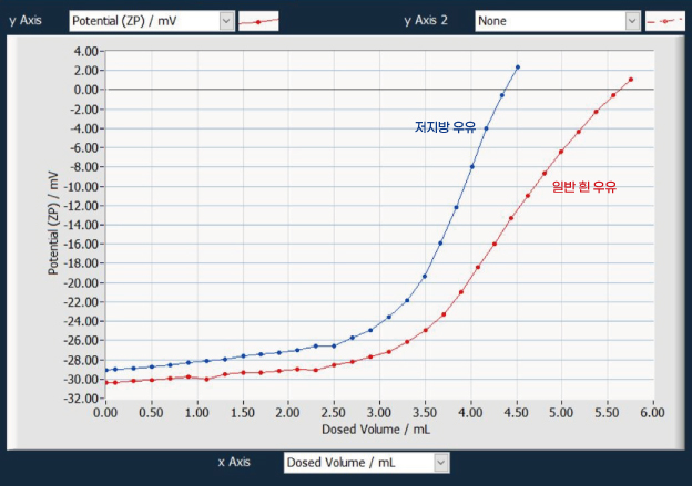 두 우유의 초기 제타 전위 값은 약 -30mV로 비슷하며 수치로 보아 매우 안정적인 상태인 것을